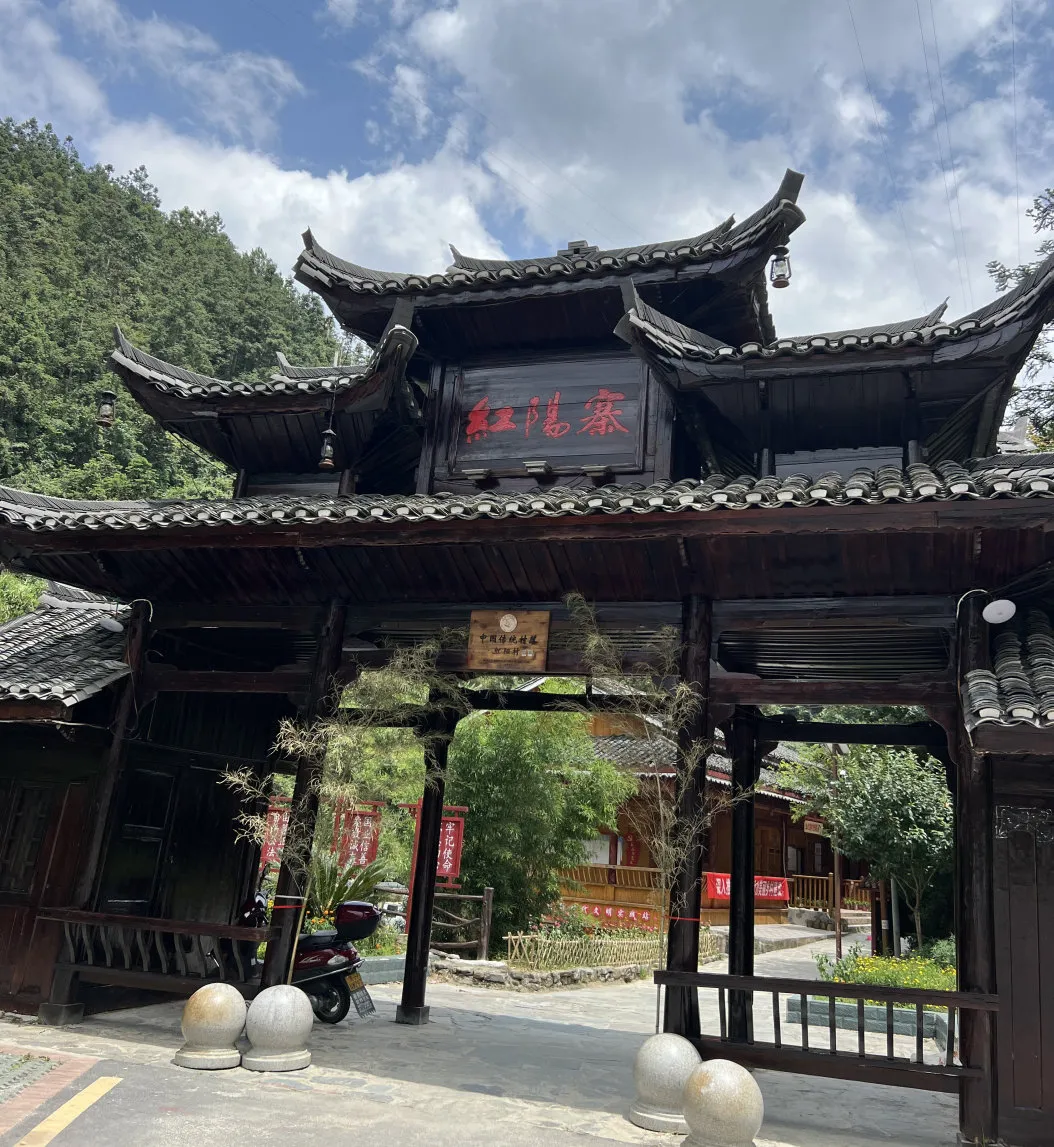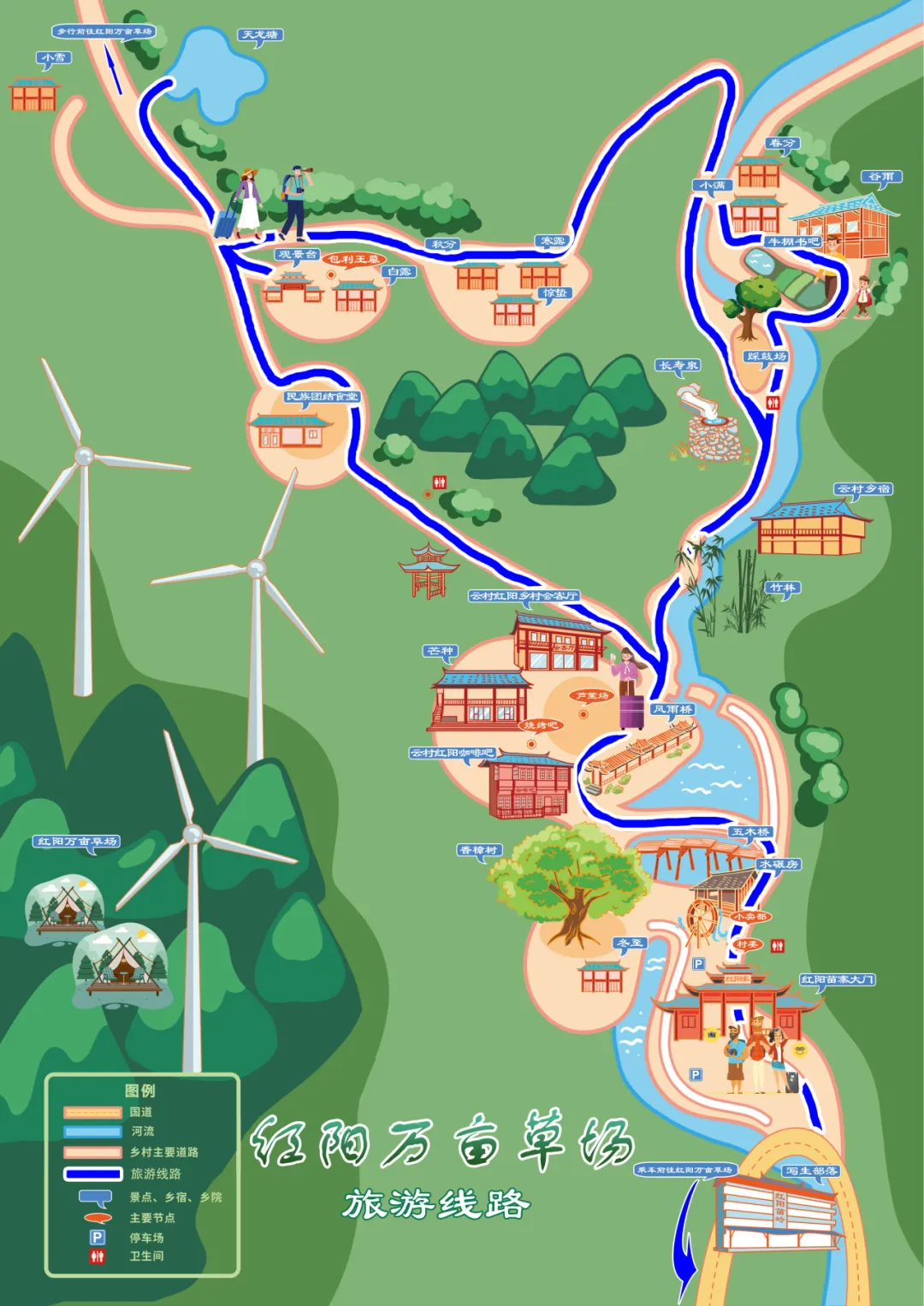 红阳寨门(体验盛装迎宾拦门酒、与寨门合影打卡)----五木桥(与五木桥合影打卡)----香樟树(体验千年古树祭祀)----芦笙场(体验踩踩芦笙活动)----长寿泉(品尝长寿泉水)----牛棚书吧(翻阅台江历史文化书籍、体验打糍粑活动)----观景台(观看红阳寨全景、了解苗家反清英雄包利王故事)----天龙塘(观看塘边美景、了解天龙塘故事)----红阳万亩草场(观草场风光、品野奢烧烤、住星空云宿)
