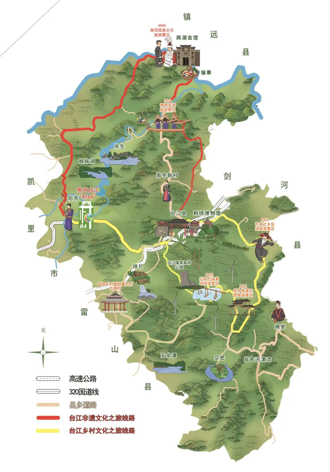 台盘村(观看篮球赛事和非物质文化遗产项目歌舞表演、体验趣味篮球赛事活动、与球场合影打卡)----施洞苗族文化旅游景区(游苗族古镇、感受红色文化、赶乡场,体验传统民俗活动如穿银衣、踩鼓舞,体验传统手工艺制作如银饰制作、刺绣、蜡染)----锦绣长滩景区(拦门酒、龙舟体验、逛刺绣博物馆、苗族歌舞展示、体验传统民俗做姊妹饭)---- 台江县城(参观非遗展示馆、探刺绣博物馆、逛姊妹街非遗商品、品苗宴、赶苗集、蹦苗迪)。