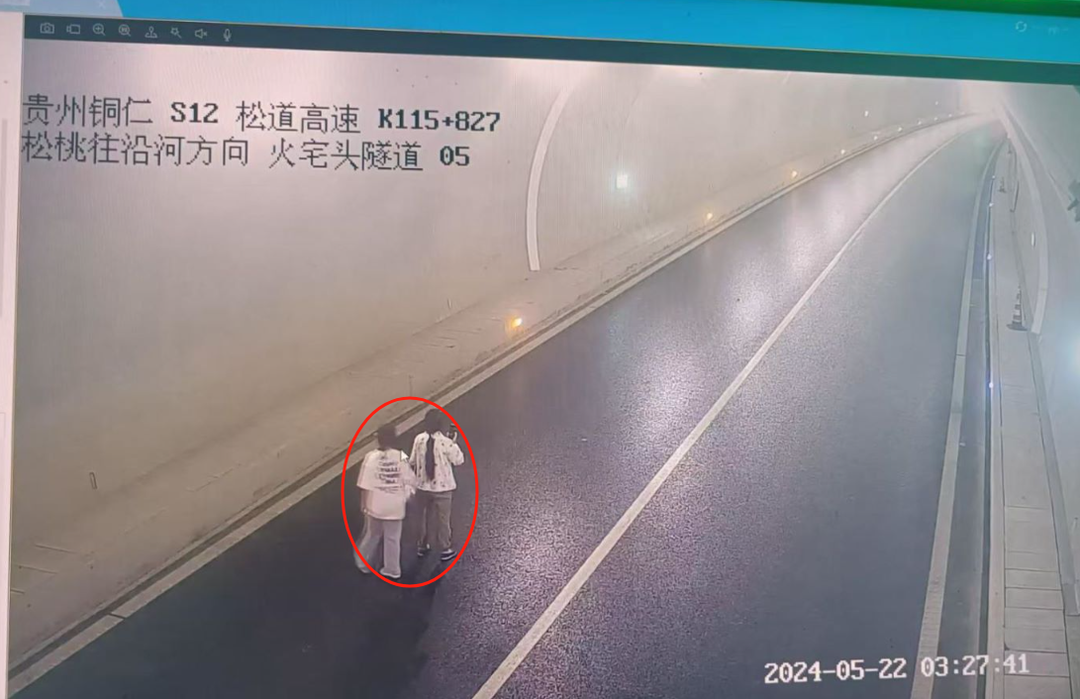 5月22日,铜仁高速交警沿河大队接沿印松高速公路监控中心来电,称当日凌晨在辖区晓景服务区有台大客车停车下客,其中两位乘客下车后沿高速公路走了,在经过隧道时,竟肆意走在行车道上,还不时的停下交流拍照,十分危险,随即指令应急人员前往将二人带离高速公路至就近收费站,排除了安全隐患。
