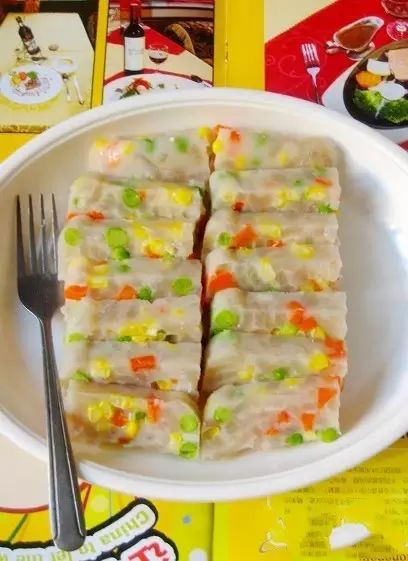 猪皮500g、青豆50g、玉米粒50g 胡萝卜粒50g、浓缩宝适量 味精适量、盐适量