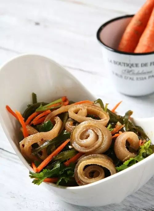 1、猪皮洗净焯水,将猪皮上面的肥肉刮净,放入锅中,添入没过猪皮的水,加入葱、姜、桂皮、八角、小茴香、花椒、香叶、1勺老抽,烧开,调小火炖煮1个小时或高压锅20分钟,切条。 2、海带洗净焯水,胡萝卜切丝,大蒜切末,香菜切小段。 3、半勺辣椒油、花椒油、香油、盐2克、生抽半勺、糖1克、陈醋半勺,调匀。 4、将切好的猪皮、海带、胡萝卜丝、蒜末、香菜,加入调好的料汁拌匀即可。