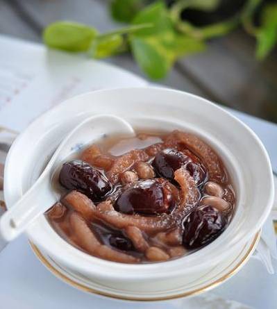 1. 炸猪皮提前泡发,并用清水浸泡至紧致有弹性,切成细条。 2. 红枣洗净,花生提前浸泡2小时。 3. 砂锅里倒入清水,放入姜片、炸猪皮,倒入花生、红枣、冰糖(或精盐)大火煮开,小火煨炖1小时即可