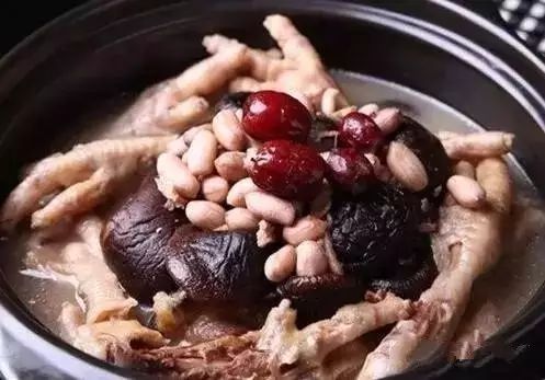 >>健脑汤<< 香菇花生核桃煲鸡脚 材料:香菇6个,花生50g,核桃肉50g,生姜3片,鸡脚10只。 做法:鸡脚洗干净焯水,上述药材洗净,加入适量开水放入锅内,煮沸后放入食材,煮1.5小时,调味即可。