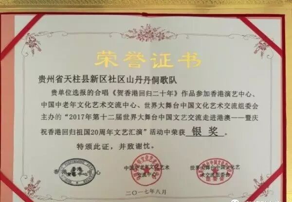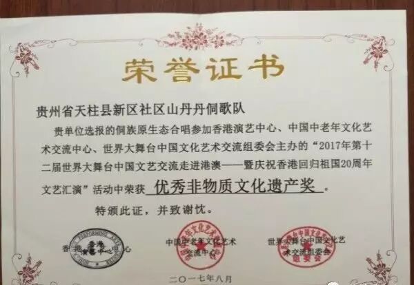 也因如此,评委无法再去说这天籁之音的长短,完美的传承下来就是天下最好,人类最珍宝贵的东西,组委会给《山丹丹侗歌队》表演唱颁发了金奖、银奖,授予世界大舞台非物质文化遗产荣誉旗帜一面。