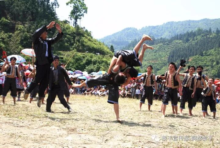 摔跤文化的地理历史四寨位于双江乡东两公里,距离黎平县城63公里。这里地处河谷,村公路穿寨而过,村前为田坝,海拔240米。全村有四寨、平城、摆架三大自然寨,7个村民小组414户,1858人,均为侗族。厦蓉高速公路出口直达四寨平城,县级公路直至黎平县城,交通便利。 四寨的历史悠久,古称千三四寨。南宋时期,这里的开基始祖是“公记”和“公力”两兄弟,兄弟俩追随苗兰祖先,从“三色古州(现榕江车江一带)”顺河迁徙而来,到四寨河口(侗语称孖记)时,“公记”上山开寨创业,后形成七百苗寨。“公力”则沿江而上到寨高定居,公力有三个儿子:大儿子叫公高,二儿子叫公闹,三儿子叫公暖。三兄弟各居一方创业,公高居寨高,公闹居四寨,公暖居黄岗。公闹,在四寨建村立寨,侗语得名虽彩。侗语“虽彩”即四个村寨之意,汉语称为四寨。新中国成立后,这里曾设立过乡、公社、大队、公区、村等行政组织单位,这些单位对四寨摔跤节日发展来说非常重要,都非常支持侗族摔跤活动,也是推动侗族摔跤文化发展的后盾。 摔跤文化的历史背景四寨有侗族摔跤之乡的美称,其有积极光辉的发展历程,其摔跤文化的形成,是有相当的历史背景。 相传在明朝喜宗(1621年至1628年)时期,朝政腐败,世态混乱不堪,各寨匪盗成群,关羊吊马,强夺百姓钱财,寨上鸡犬不宁,民众苦不甚言。为加强防范,四寨、寨高商议联盟,共同抗拒匪徒。为统一行动,双方决定选出一位武艺高强、德高望重的首领,带领两寨村民,共同铲除盗匪。 四寨推举出武术高手的公蛮,寨高推举武术雄霸一方的公柳,约在当年农历三月十五日进行比武。两人在两寨之间的田坝里进行比武,比了一百个回合后还不分胜负。最后,民众要求两人贴身肉搏,以摔倒对方为胜。结果两人还是不分胜负。众人觉得没有再比的必要,共同拥戴他俩为首领。此后,公蛮、公柳同心同德,带领两寨民众铲除了四寨、寨高一带的盗匪。周围村寨的盗贼,也闻风逃遁。保全一方民众的平安,达到日不关门夜不闭户,牛羊放置山上,也无人牵要的平安境况。为纪念公蛮、公柳两位首领,两寨村民约定每年三月十五日由四寨、寨高轮流办节,邀请周边村寨前来“月也”,在两寨之间的田坝里举行摔跤比赛,切磋技艺,增进友谊。此项比赛,经久成俗,成为一项增强体质的体育活动,延续至今,已有500多年的历史。 从武术到摔跤的发展演变四寨,是侗族摔跤的发源地。新中国成立之前,这里的村民爱好武术、拳术,崇尚武打,散打和冷兵器时代的火棍、刀枪的使用。 四寨、寨高的部落联盟,曾发生过多次打击其他的部落村寨群体,成了雄霸一方的部落村寨。这里历经500多个春秋的发展演化,500多年的文明进程,社会治安秩序得到了相对稳定,村民的人居环境得到了改善,物质生活得到了提高,文化素质有了进步。传统的武术散打,对抗性粗俗的打斗,经过长期的改良,成了一项侗族重要的体育文化竞技活动,成了表演性的摔跤节日活动。  摔跤节活动的程序,也是非常讲究的。村民向我们介绍说:铁炮响后,参赛队伍按照寨老们商定的次序,跟着芦笙队伍入场,来到赛场中央,选手们互相施礼,然后退到赛场两端席地而坐,等待点名上场比赛。 有关发展四寨摔跤的生态环境和摔跤训练场地,26岁的摔跤手吴凯成告诉我们:他曾参加过在广州、贵阳举办的全国少数民族传统体育运动会,并获多个表演赛奖牌。他说:侗族孩子一般从七八岁开始练习摔跤,在侗乡村前屋后,田间地头都是现成的训练场。训练时间也不受限制,春夏秋冬,只要有时间,人们就聚集在一起,来一场摔跤。节庆更是摔跤助兴的最佳时间,在增加喜庆气氛的同时,摔跤手也慢慢地练就了技术,渐渐成为摔跤能手。 侗族摔跤规则、摔跤技术、摔跤社会效益方面,四寨村原村支书韦光海向我们一一道来:他说,侗族摔跤规则是以身体先着地者输,一般三局两胜。从技术上讲,有提摔、绊脚摔、拉摔、抱摔等四种,获胜者会得到象征性的物质奖励。 在侗族摔跤活动,产生良好的社会效益,受到侗族民众的欢迎,流传区域广阔。韦光海说:侗族这项摔跤体育话动,流传于双江乡的四寨、坑洞、寨高、黄岗,从江的谷平、往洞、增冲以及榕江的宰麻等地区。现己发展成一种集武术与娱乐为一体的传统体育竞技活动,产生了良好的效益。1997年以来,每年3月15日的四寨摔跤比赛,都吸引了不少来自广西、湖南、浙江、广州等地的游客和七邻八寨的群众观看。有时观众多达七八万人。在侗族摔跤表演节目上,在国家、省多项比赛中屡获金奖。 2004年10月19日,因侗族摔跤活动,双江被评为第七批全国“亿万农民健身活动”先进乡。2013年被民委评为“民族特色旅游村寨”,被贵州侗族协会评为“魅力侗寨”; 11月被国家体育总局授予“中国体育非物质文化遗产保护与推广项目”,2015年被省环保厅命名为省级生态村。