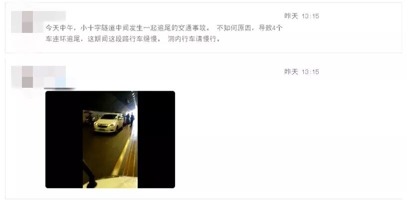 小编转述微友原话:“今天(2017-11-11)中午,小十字隧道中间发生一起追尾的交通事故。 不知何原因,导致4个车连环追尾,这期间这段路行车缓慢。 洞内行车请慢行。”