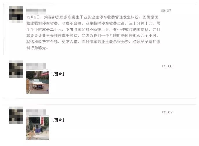 小编转述微友原话:“12月5日,鸿森御泉居多次发生于业务业主停车收费管理发生纠纷,因御泉居物业强制停车收费,收费不合理。业主临时停车收费过高,三十分钟十元,两个半小时就是二十元,随着时间金额不断往上升,有一种敲诈勒索嫌疑。并且非要要让业主办理停车手续费,又因为我们一个月临时来回停那么几个小时,就这样收费不合理,更不合情。临时停车的业主表示很无奈,必须给予这种强制行为曝光。”