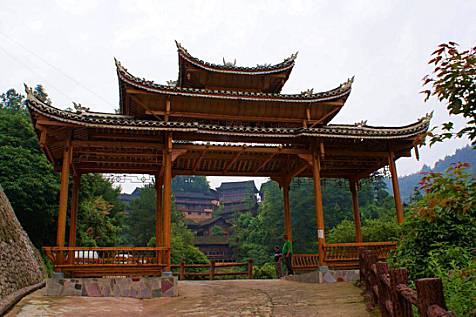 寨中吊脚楼建在斜坡上,吊脚楼低的七八米,高者十三四米,占地十二三个平方米。屋顶除少数用杉木皮盖之外,大多盖青瓦,平顺严密,大方整齐。吊脚楼一般以四排三间为一幢,有的除了正房外,还搭了一两个"偏厦"。每排木柱一般9根,即五柱四瓜。每幢木楼,一般分三层,上层储谷,中层住人,下层楼脚围栏成圈,作堆放杂物或关养牲畜。住人的一层,旁有木梯与楼上层和下层相接,该层设有走廊通道,约1米宽。堂屋是迎客间,两侧各间则隔为二三小间为卧室或厨房。房间宽敞明亮,门窗左右对称。中堂前有大门,门是两扇,两边各有一窗。中堂的前檐下,都装有靠背栏杆,称"美人靠"。