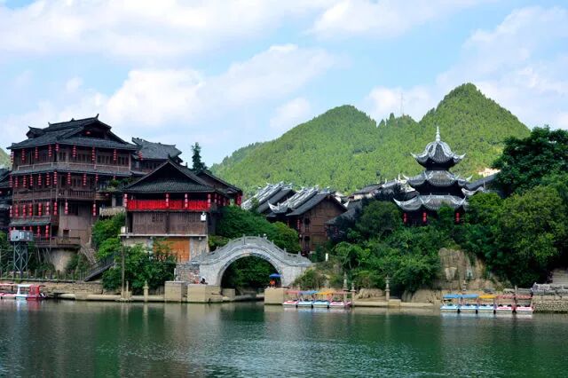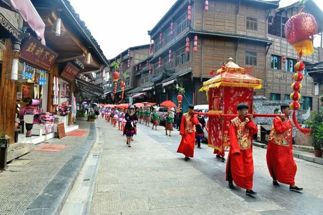 “打锣鼓、吹唢呐、接新人、到婆家……”这是下司古镇最具人气的一个常态表演活动,游客跟着行进的队伍一路经芦笙广场、拜码头、过连心桥、入洞房,在别有生趣的婚俗表演中,享受着古镇的美好与惬意。