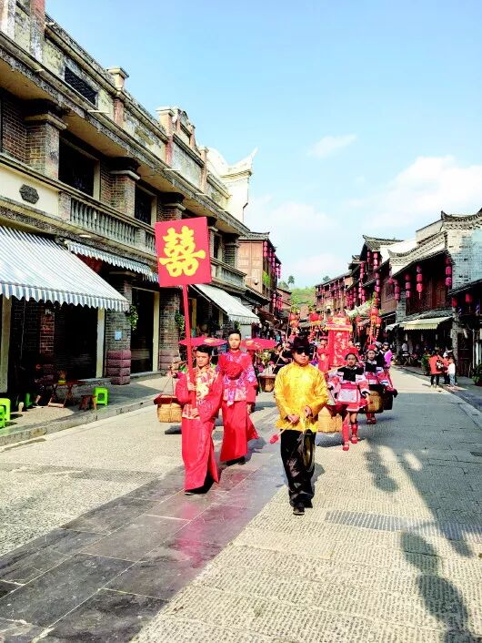 近中午时分,街口传来敲锣打鼓声,身着红衣喜裳的一队人马浩浩荡荡而来,每天两场的“喜遇下司”表演活动又开始了。