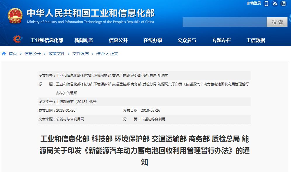 近日,工业和信息化部、科技部、环境保护部、交通运输部、商务部、质检总局、能源局印发《新能源汽车动力蓄电池回收利用管理暂行办法》(以下简称《办法》)的通知,要求汽车生产企业应建立动力蓄电池回收渠道,负责回收新能源汽车使用及报废后产生的废旧动力蓄电池。《办法》自2018年8月1日施行。