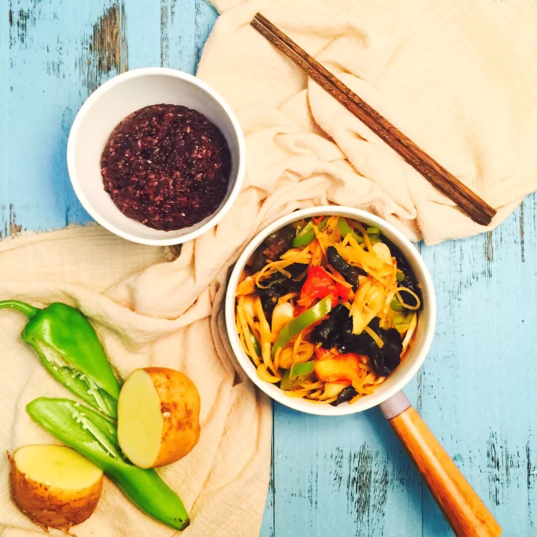 步骤: 1、将木耳泡发后切丝; 2、豆腐干洗净与香菇一起切片,胡萝卜与紫甘蓝切细丝; 3、锅中放水,将豆腐干,香菇,木耳放进去; 4、加酱油和盐煮至软; 5、放入胡萝卜丝,紫甘蓝; 6、最后关火,放入茼蒿叶,醋,和白胡椒。