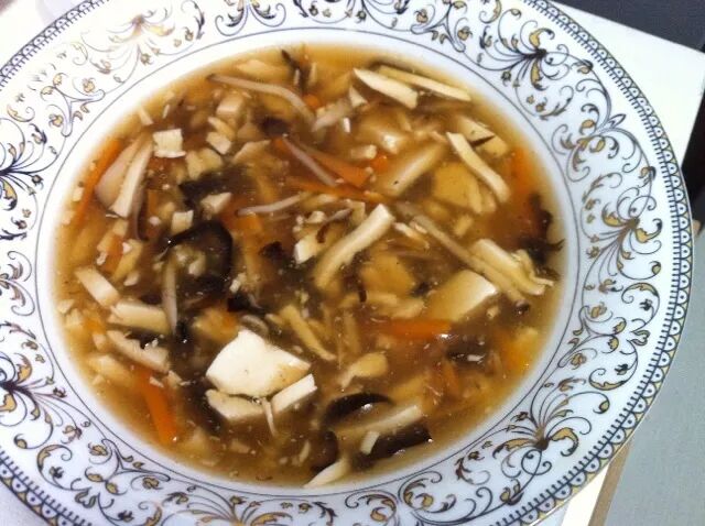 步骤: 1、胡萝卜、黑木耳,香菇、豆腐都切丝。 2、胡萝卜水里焯一下,水留着烧汤。 3、香菇丝、黑木耳丝油里煸炒,加入胡萝卜丝和汤水,再加清水煮沸,加入豆腐丝; 4、加生抽适量,加淀粉水,加盐调味,起锅前加香醋,一锅美味可口的酸辣汤完成。