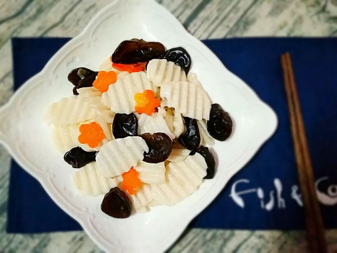 材 料: 胡萝卜,鲜香菇,黑木耳,豆腐,淀粉,生抽,盐,香醋
