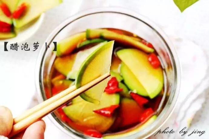 晒点萝卜干,吃之前用水泡软,加点醋、辣椒油当开胃小菜吃。用醋腌萝卜也不错,新鲜萝卜水分大,切片,直接泡在醋里面,在阳台或冰箱放置一会,让萝卜入味。