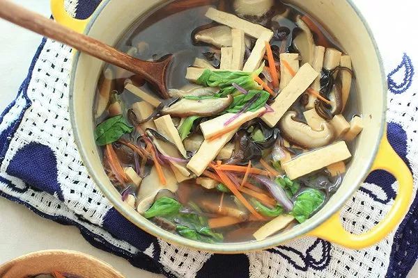 材 料: 厚豆腐干100克,鲜香菇100克,木耳(干)10克,水450毫升,茼蒿10克,紫甘蓝20克,胡萝卜30克,酱油1大匙,盐2克,醋1茶匙,白胡椒适量