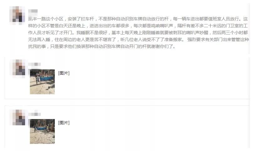 小编转述微友原话“凯丰一路这个小区,安装了拦车杆,不是那种自动识别车牌自动放行的杆,每一辆车进出都要值班室人员放行。这样的小区不管是白天还是晚上,进进出出的车都很多,每次都是鸣响喇叭声,隔杆有差不多二十米远的门卫室的工作人员才听见了才开门。我睡眠不是很好,基本上每天晚上刚刚睡着就要被刺耳的喇叭声吵醒,然后两三个小时都无法再入睡,住在周边的老人更是苦不堪言了,听几位老人说受不了了准备搬家。 强烈要求有关部门出来管管这种扰民的事,只是要求他们换装那种自动识别车牌自动开门的杆就谢谢你们了。”