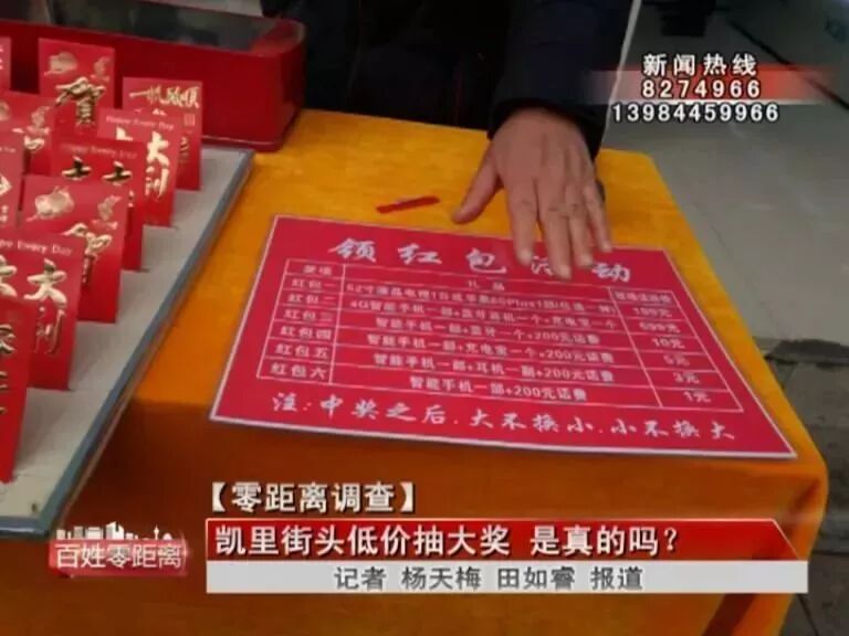 街头低价抽大奖送礼 看似天上掉馅饼 其实是骗子挖好的坑 如果您经不住免费的诱惑 那么就会掉入骗子的圈套 近日,我们接到了市民打来的热线说,在凯里洗马河有人摆摊抽奖,说是低价就能抽到大奖,还有很多人真的在现场中奖,这吸引了很多市民区参与,但是这是真的吗?其中有没有有什么内幕呢?我们的记者也进行了调查采访。 记者现场暗访看到摆摊的老板一直的解说着:“321看中不中一等奖,抽上一等奖就请我吃饭好不好,昨天有个大姐,五等奖,交两块钱得一部手机,一把剃须刀,只需交两块钱”。 记者在现场观察发现,一名女子先交了200元押金,然后打开一个红包,里面的小纸片显示她中了五等奖,随后摊主将200元押金退给了该女子,该女子只需给2元钱就获得了一部手机和一把剃须刀。随后记者又到了另外几个摊点,发现这里的抽奖方式和操作都是一样的,也是先交200元押金再抽红包,结果都是抽奖者用几元钱就获得手机和其它奖品。记者也看到在抽奖台的桌面上有一个中奖明细,有七八种奖项,每一项交的钱不同,礼品也不同,但是都没有超过200元。其中的2等奖,扣除押金后,还需要补交499元。看到这里,记者也有一些疑问,于是上前询问了摊主。 记者:如果我只有500块,我中了二等奖,我补不上这个钱怎么办?摊主:那从抽奖开始,你什么时候来要都可以。 记者:但是200块钱不退,是吗? 摊主:嗯。 低价抽大奖 中奖的都是“托” 也就是说,只要你交了押金,不管你要不要奖品,押金都不予退还。 在现场记者发现,中奖的这些人,都是有备而来的,这些人包里只有200元钱和十几张一块块的零钱,每当有新的人来到摊点处,他们都会一拥而上,上演一次的抽奖中奖过程,随后离开。在记者暗访过程中,发现这些托一旦中奖,手机都是在摊点后的正规营业商店兑换。那这种抽奖活动,是他们举办的吗?记者也进店进行了询问,店主告诉记者,手机可以兑换,他们也可以进行保修,但活动不是他们举办的。记者也发现,抽奖所给的手机并不是市面上常见的品牌,而是一些比较陌生没见过的牌子,当记者询问更多关于手机质量的问题时,店里的工作人员却没有正面回答。 既然抽奖活动不是商铺举行的,那为什么中获奖后手机要去店里兑换,并且承诺保修呢?就在记者继续采访想要探寻其中的究竟时,还发生了一件奇怪的事。 记者从店铺暗访出来不到两分钟的时间里,刚刚还热火朝天进行的抽奖活动,一下子全部收摊了。正当记者准备离开时,看到刚开始的那个摊主在店铺里像记者招手。 摊主:来,快来嘛。 记者:怎么你们怎么不摆啦? 摊主:城管不让摆啊。 原来是因为担心有执法人员执法,所以他们才收摊了,而叫记者过去也是为了让记者继续参与抽奖。 市民知道有猫腻 望有关部门解决 记者也了解到,这样的抽奖活动在凯里其实已经出现了很久了,记者随机在街上进行询问,发现很多市民都知道这样的抽奖有猫腻。  市民小刘 这个我是在洗马河的那个岔路口看的,他们经常摆在那里,我觉得是假的,因为我每次路过,每次都是那一批人,都是他们的托。  市民陈阿姨 洗马河那一排有五六家,那个太坑害人了,特别是农村的,挺可怜的,人家挣个钱也不容易。 在采访中,不少市民告诉记者,他们虽然自己知道其中有猫腻,不会去参与,但是也看到过有人被骗,希望有部门来管管。  市民小刘 政府对这现象应该多监察,杜绝这种现象,因为很多人因为这种事情上当受骗。 工商部门执法存在难度 对于这样的抽奖活动,到底有没有触犯法律,有哪个部门能来管管吗? 记者也来到了凯里市工商质量管理局了解情况,工作人员告诉记者,其实他们已经接到多起这样的消费者投诉,也到现场调查过,但是一直没有拿到相关证据。 凯里市工商质量管理局工作人员: 他这个抽奖活动,可能有一定的手脚,但是这个手脚呢,我看了整整一个小时,我也看不出,就是说不好取证。 因为有奖销售是国家法律允许的,消费者相当于是拿钱买了手机,所以并不能认为是被骗,虽然其中确实存在猫腻,但却难以取证,工商部门也很想整治,但是缺乏有力的证据。 凯里市工商质量管理局工作人员: 我们从执法的角度上讲,我们可以开箱验他的红包,但是我们结果是不好收场。 对于这样的情况,工商部门表示,他们采取的方式是经常进行现场执法,不准他们摆摊设点,但他们一旦离开,对方可能会继续进行抽奖活动。所以目前来说,他们更多的是从消费者入手,引导消费,正确消费,不要贪小便宜,而上当受骗。 这种抽红包赢大奖的活动,大多数人也知道里面存在猫腻,但是要找出确切的证据,存在很多困难。但如果每一个消费者,都知道其中的猫腻,不去参与,那么经营者自然也会被瓦解。在此我们也提醒消费者,千万不要再去参与这样的抽奖活动,因为天上不会掉馅饼。