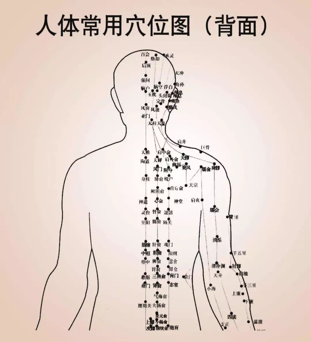 9、 背痛,直取大椎穴旁开5分处,后溪穴,外关穴强刺激。病因为寒凝后背。