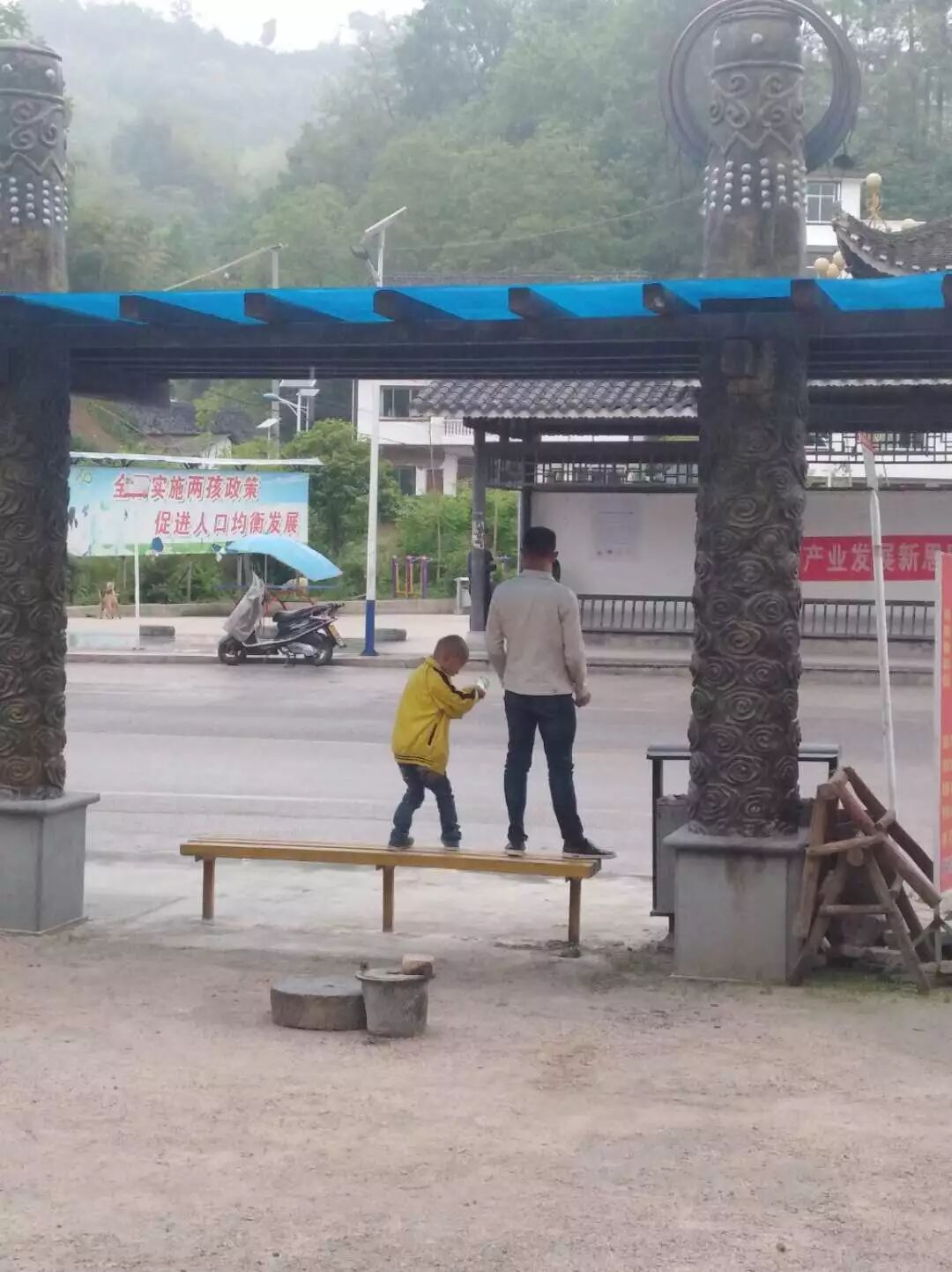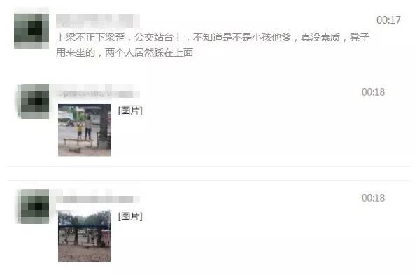 小编转述微友原话:“上梁不正下梁歪,公交站台上,不知道是不是小孩他爹,真没素质,凳子用来坐的,两个人居然踩在上面”