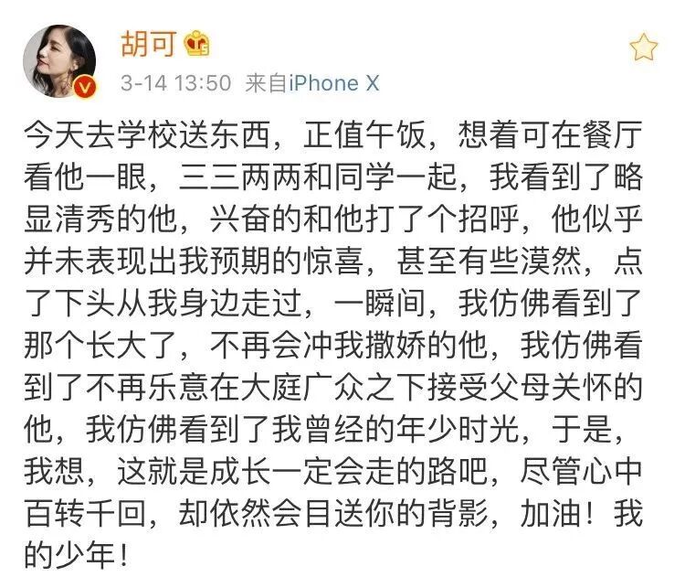 一瞬间,胡可觉得儿子长大了,不再是那个冲她撒娇的孩子了。