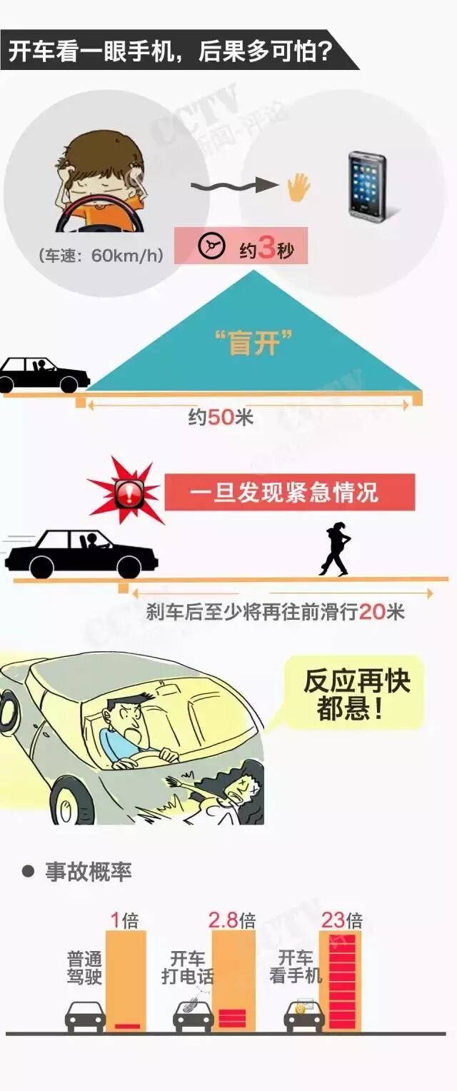 以下事故都是手机惹的祸 一辆摩托车与小轿车发生碰撞,摩托车主受伤,且负全责。从当时的监控画面可以看到,摩托车驾驶员一边骑车一边低头看手机。 江苏一公交车司机,7分钟内看手机39次,酿成车祸。 大巴司机低头看手机,与大货车相撞,光是看画面,都觉得结果惨烈。 十祸九快,还有一个手机在作怪,无论是开车玩手机还是走路玩手机,都必定会让人分心、转移视线,极易发生事故!