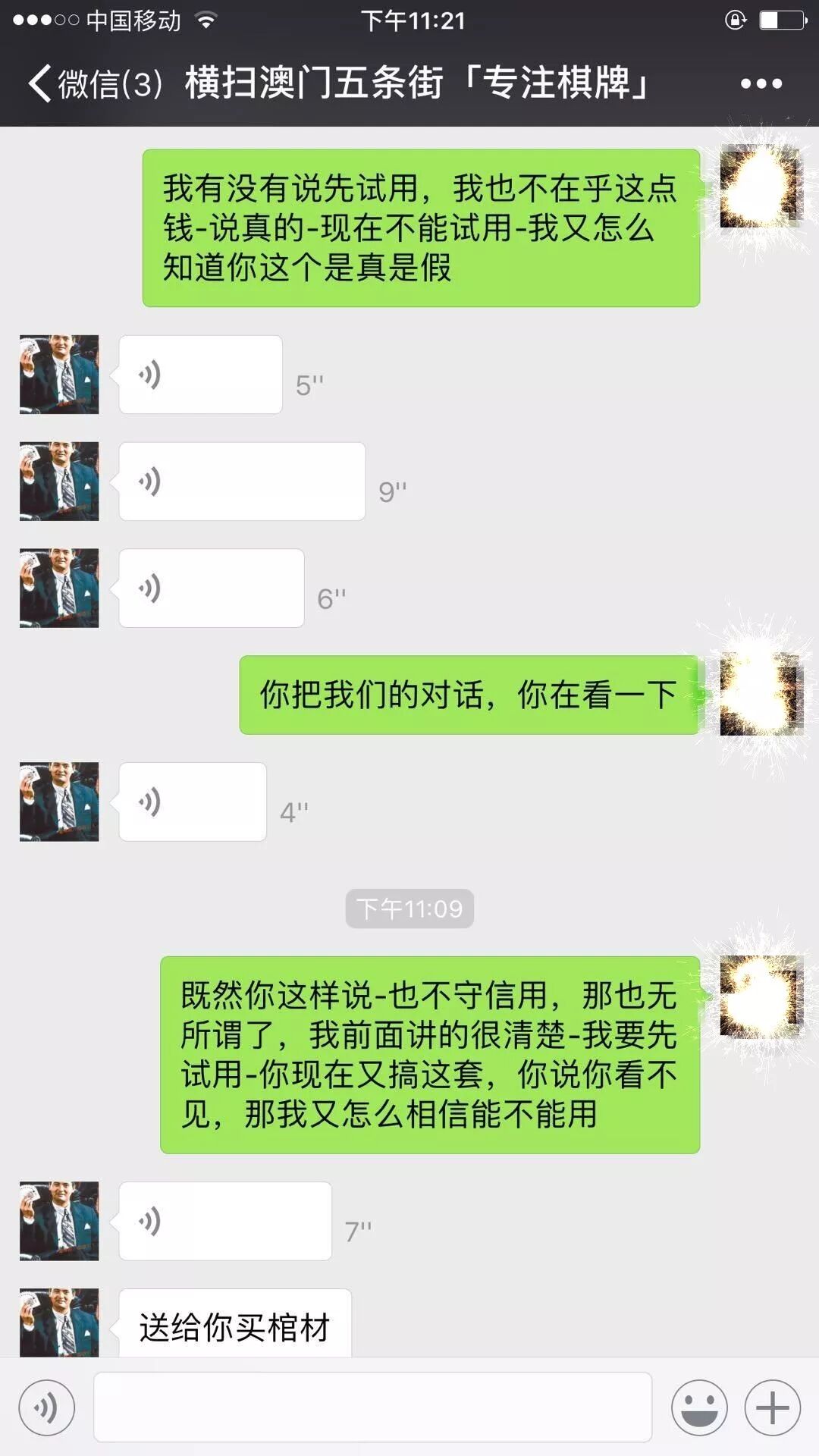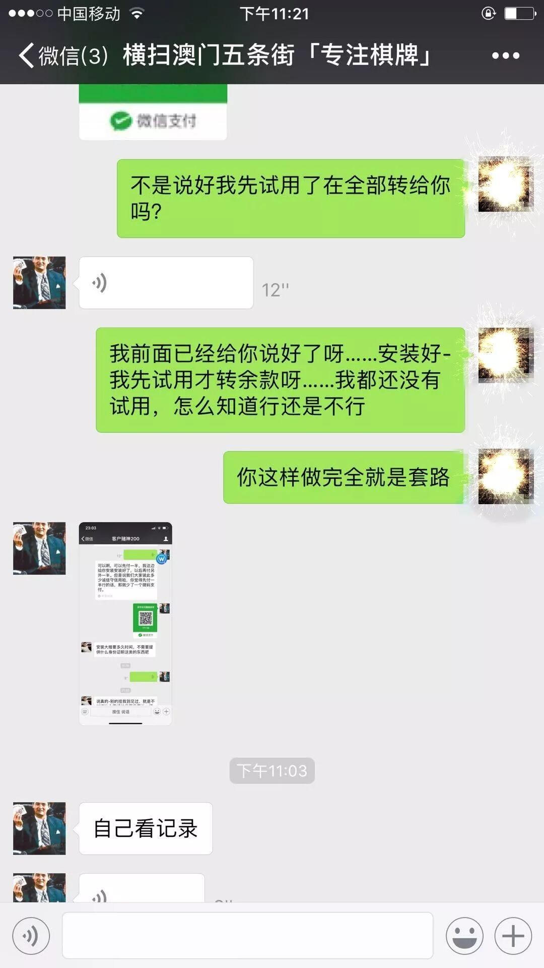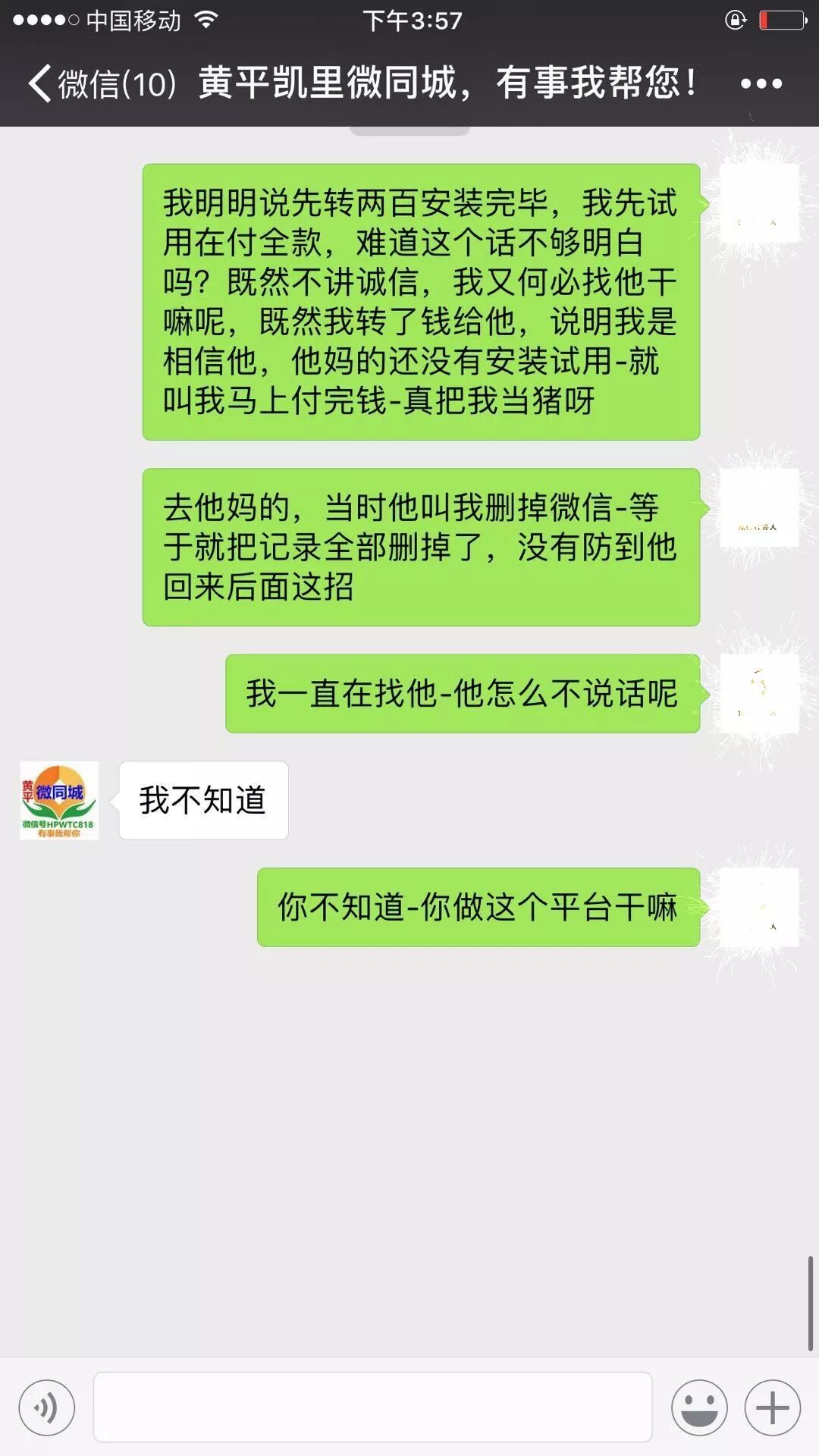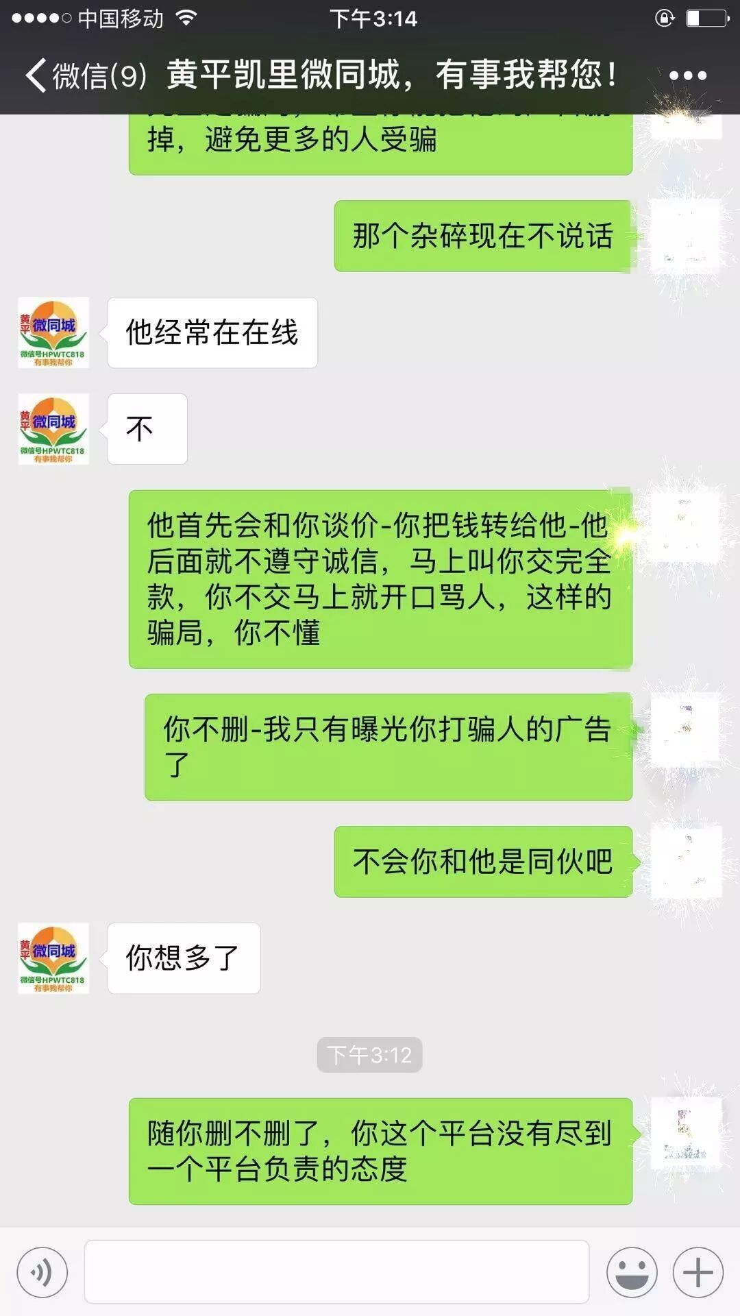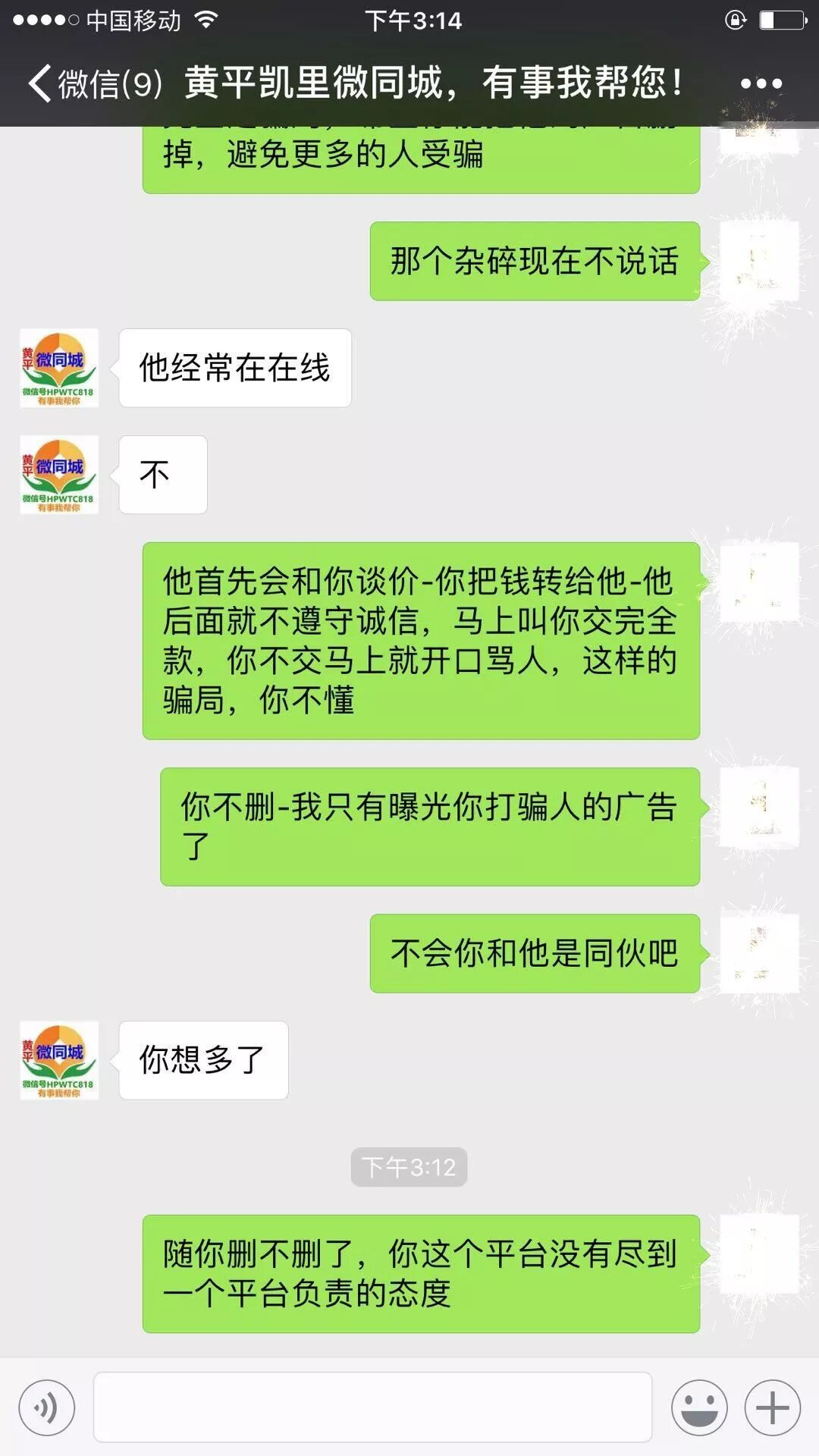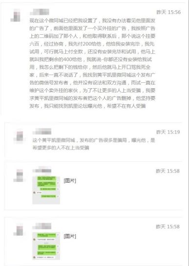 小编转述微友原话:“这个黄平凯里微同城,发布的广告很多是骗局,曝光他,是希望更多的人不在上当受骗,现在这个微同城已经把我设置了,我没有办法看见他里面发的广告了,前面他里面发了一个买外挂的广告,我按照广告上的二维码加了那个人,和他取得联系后,那个说这个挂要六百,经过协商,我先付200给他,他给我安装完毕,我先试用,可行就马上付全款,还没有安装完毕和试用,他马上就叫我把剩余的400给他,我就说-你都还没有安装给我试用,我怎么把剩下的钱给你,然后他就马上开口骂我死全家,后来一直不说话了,我找到黄平凯里微同城这个发布广告的微信号发布者,他并没有设法和双方沟通,而试一直在维护这个卖外挂的家伙,为了不让更多的人上当受骗,我要求黄平凯里微同城的发布者把这个人的广告删掉,他坚持要发布,我只能找到凯里论坛曝光他,希望不在有人受骗。”