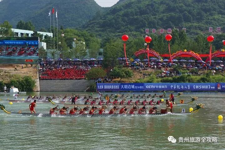 五,思南乌江 思南位于乌江中游,是古代乌江航运的枢纽,有乌江明珠之称。思南每年端午节会举办大型的龙舟大赛,每年都有来自乌江沿岸的数十支船队参加比赛。两岸的观众更是人山人海,县城和周围村寨的百姓携老扶幼选取了最有利于自己的观赏角度,等待着最具观赏性的节目——抢鸭子比赛的上演。