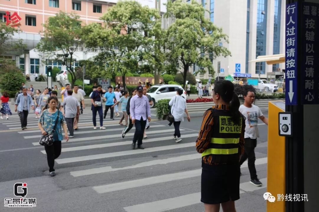 韶山南路州医院门口,是凯里城区人流量比较大的一条斑马线,早晚高峰期时几乎每次绿灯通行的人流都在五六十人左右。江忠萍是负责对这条斑马线进行交通劝导的交通协管员,她说,这个路口在上下班高峰期的通行量非常大,有很多行人在红灯亮起时仍然还在斑马线上慢行,非常不安全,每次他们都会吹哨或大声提醒,遇到一些腿脚不便的人或者走得慢的老人和小孩,他们也会上前搭把手,让大家能够快速安全的通过人行横道。