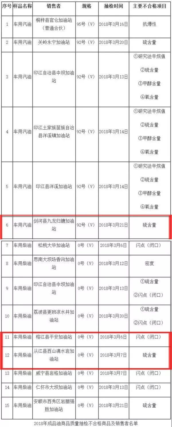 这些问题油品分别来源于桐梓县官仓加油站、关岭永宁加油站、印江自治县中坝加油站、印江土家族苗族自治县洋溪镇加油站、印江县洋溪加油站、剑河县九龙归塘加油站、松桃大华加油站、思南大坝场香沟加油站、荔波县更班凉水井加油站、榕江县平安加油站、从江县西山滴水岩加油站、威宁县岩格加油站、仁怀市大坝加油站及安顺市西秀区岩腊强胜加油站。