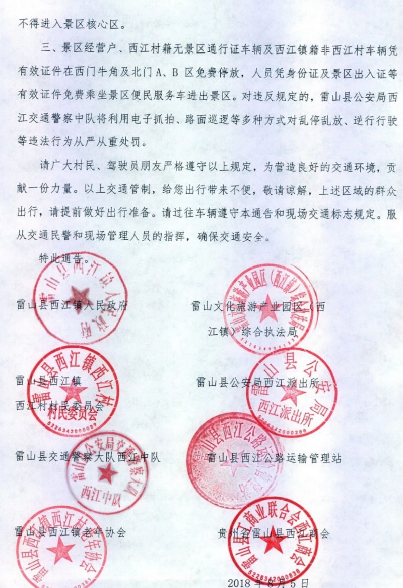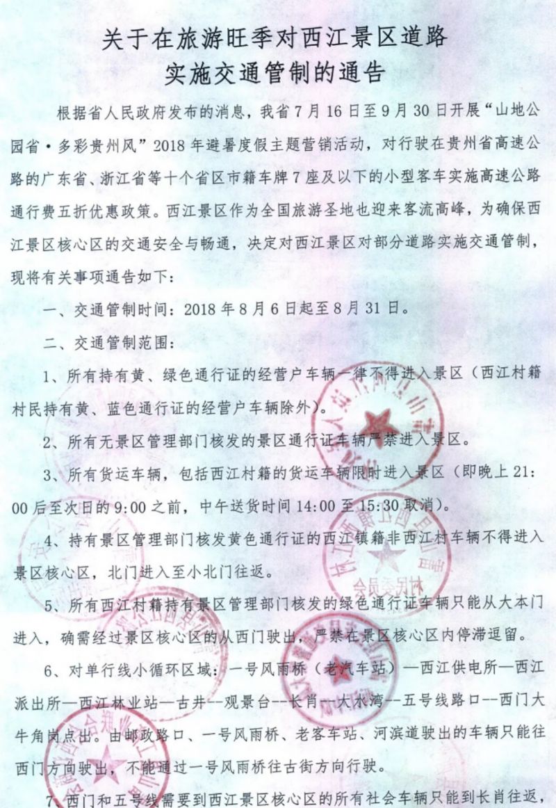 为营造良好的交通环境,为广大游客提供更好的旅游服务,8月5日,雷山西江交警发布了《关于在旅游旺季对西江景区道路实施交通管制的通告》,通告表明,8月6日至8月31日西江景区道路将实施交通管制。