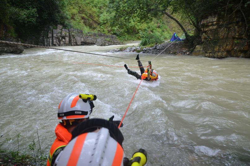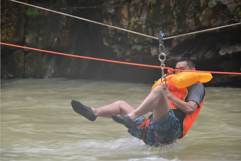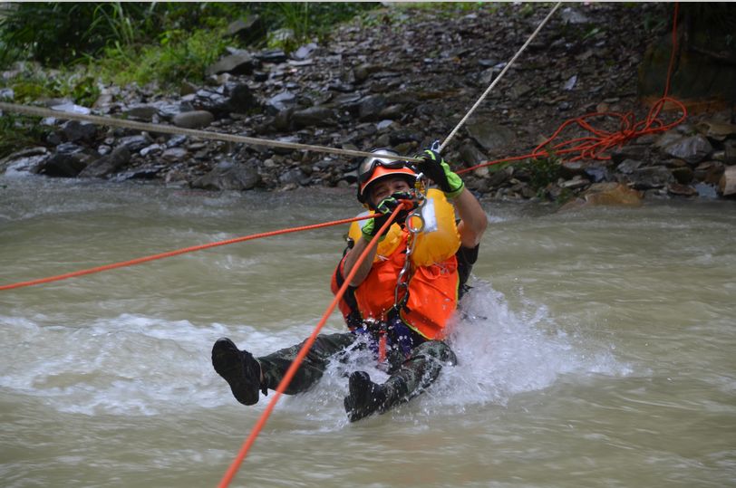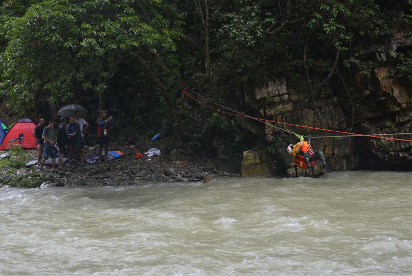 由于雷山县的强降雨天气已经持续了11个小时,且事故现场又位于海拔2000米以上的雷公山,经过一个多小时的奔波,10时50分许,救援人员根据报警信息赶到了事故发生地“四道瀑”,开始沿着河流搜救。大约10分钟后,发现6名驴友在一处河对岸的洼地上,他们四周都被湍急的河水围绕,形成了一座“孤岛”,此时雨越下越大,水流也越来越急,救援工作刻不容缓。救援人员通过观察地形后,立即决定采用长绳牵引横渡的方法施救,先在两岸建立长绳索道,然后由1名救援人员横渡到对岸对被困人员进行转移,其余人员在安全的岸边进行牵引。经过3个多小时的努力,终于把6名驴友全部转移到了安全地带。