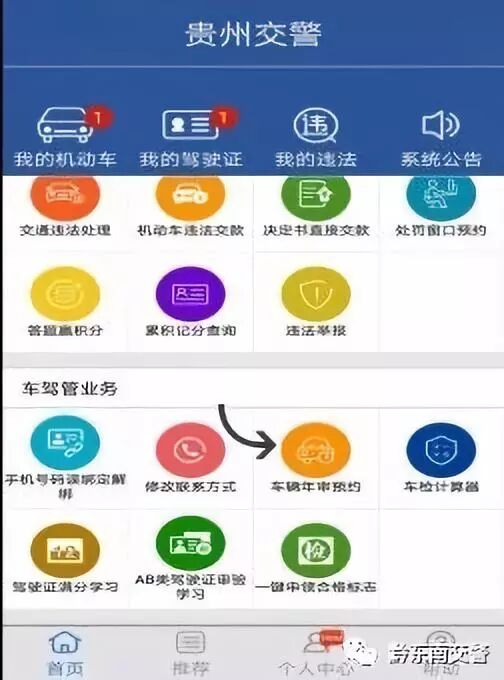 为进一步深化公安交通管理“放管服”改革,推行网上车检服务,推动检验机构开通互联网、手机APP、语音电话等“点对点”车检预约服务,增设预约窗口通道,方便群众“随到随检”。实行网上申领免检标志,无需签注行驶证,实现网上申请、邮寄送达。简化车检服务流程,推行非营运小微型载客汽车经检验机构检验合格后,车辆管理所先远程发放检验合格标志、后抽查监督检验情况,提高检验效率,落实检验主体责任。现黔东南州公安局交警支队将“交管12123”APP“、贵州交警”APP车检预约方法及路径发布如下: