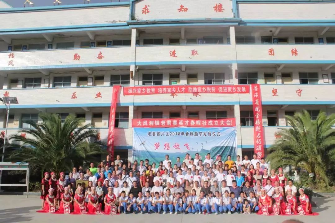 2018年8月18日,来自老君寨片区的父老乡亲、莘莘学子和社会各界爱心人士四百余人齐聚老君寨村,在老君寨小学举办老君寨片区2018金秋助学活动暨大风洞镇老君寨英才春晖社成立大会,本次活动的主题为“振兴家乡教育、培养家乡人才、助推家乡脱贫、促进家乡发展”。