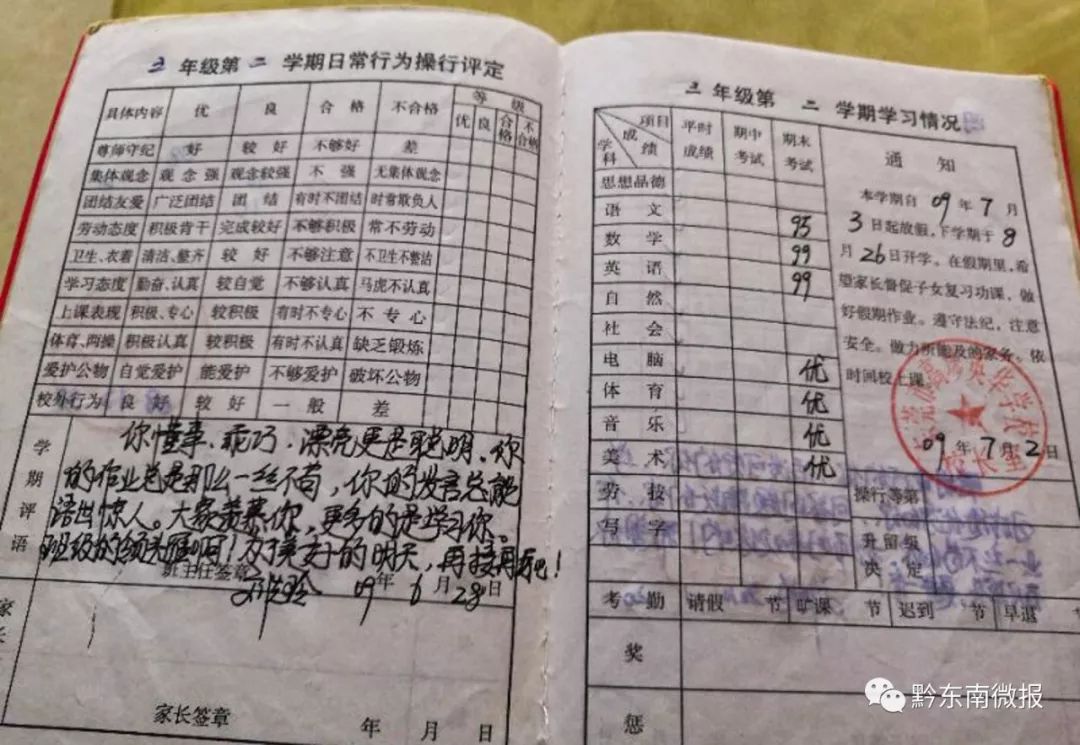“在广东读一年级到五年级上学期,她的语文、数学、英语科,每学期考试成绩大多是90分至100分。” 周颖的母亲,拿着周颖的成绩册给记者看,其它科也全是优。成绩单上老师的评语很喜人。 二年级第一学期:“你时时都在思考问题,渴望得到更多的知识,所以成绩十分优秀,受到大家一致好评,愿你不断锤炼,百尺竿头,更进一步!” 三年级第二学期:“你懂事、乖巧、漂亮更是聪明,你的作业是那么的一丝不苟,你的发言总是语出惊人,大家羡慕你,更多的是学习你。班级领头雁,努力吧,明天更辉煌。”  每学期,老师的短短几句话,反映了这位农村侗家女孩、农民工子女异乡求学坚持学习,刻苦努力的镜头!