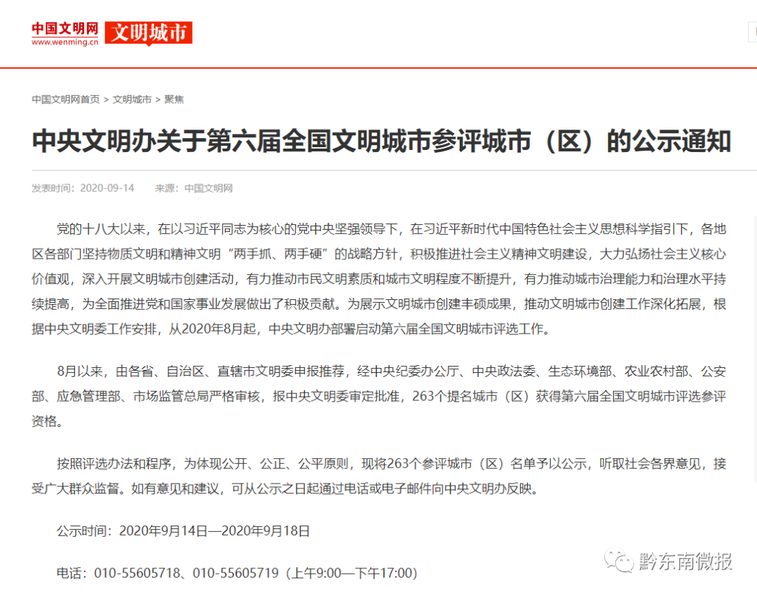 中央精神文明建设指导委员会办公室今天发布《第六届全国文明城市参评城市(区)名单》公示名单,凯里市入围。