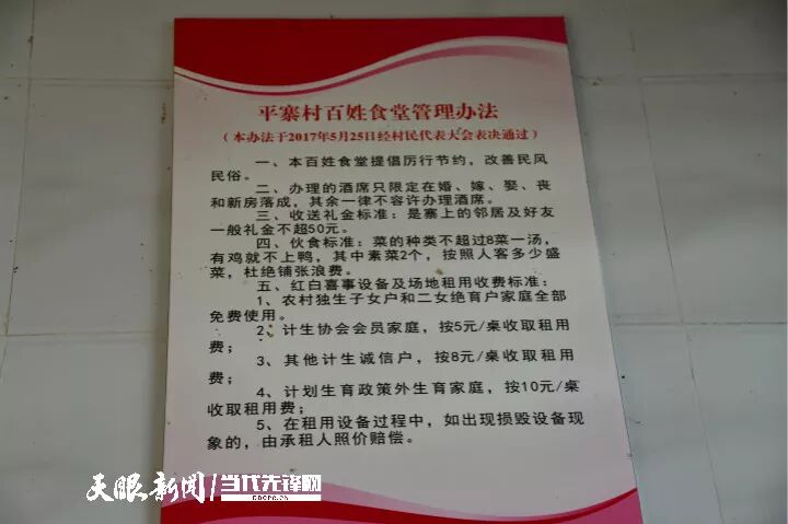 “原来村民操办红事白事,红事彩礼贵花钱,白事规矩多烧钱。自从有了‘百姓食堂’,规矩少了,一场酒席办下来,减轻了不少负担,真的很实在,不光省钱,人也轻松多了。”连续好几年获得村里“文明卫生户”的平寨村村民潘伯军说,2017年,他们家的新房子刚建好,当时就办了几桌宴席,按照《村规民约》规定不得铺张浪费,现在每家每户红白喜事宴席一切从简,风气变得好了许多。