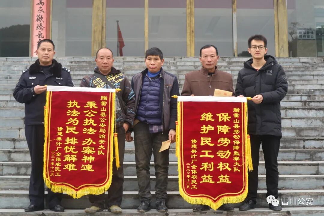 12月30日,贵州省雷山县公安局缜密侦查,破获一起拒不支付劳动报酬案,为51名工人追回拖欠工资172万元,工人们收到钱后派代表向民警赠送锦旗表示感谢。