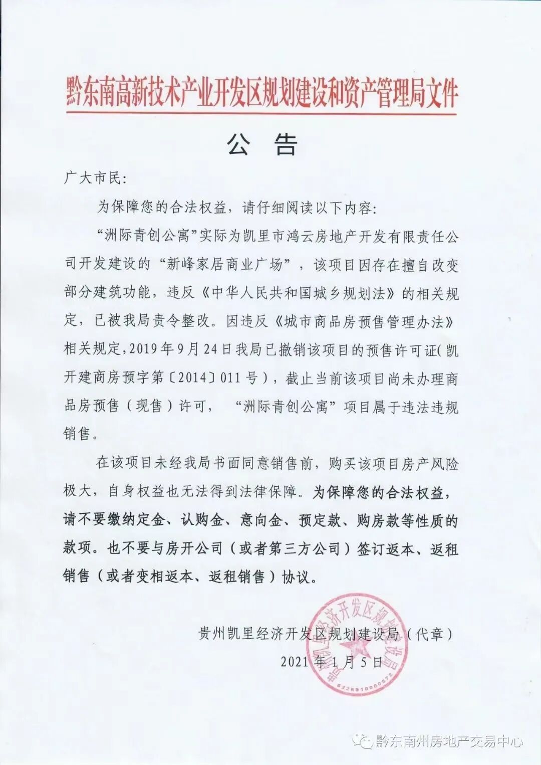 “洲际青创公寓”实际为凯里市鸿云房地产开发有限责任公司开发建设的“新峰家居商业广场”,该项目因存在擅自改变部分建筑功能,违反《中华人民共和国城乡规划法》的相关规定,已被我局责令整改。因违反《城市商品房预售管理办法》相关规定,2019年9月24日我局已撤销该项目的预售许可证(凯开建商房预字第[2014]011号),截止当前该项目尚未办理商品房预售(现售)许可,“洲际青创公寓” 项目属于违法违规销售。