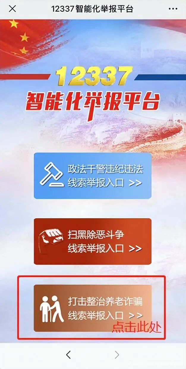 进入“12337”后点击“打击整治养老诈骗线索举报入口”。
