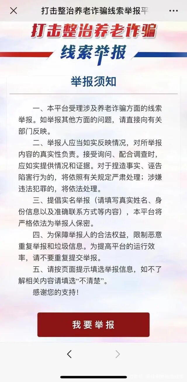 养老诈骗是一种针对老年人群体的诈骗行为。犯罪分子以提供“养老服务”、投资“养老项目”、销售“养老产品”、宣称“以房养老”、代办“养老保险”、开展“养老帮扶”等为名,来实施侵害老年人合法权益的各类诈骗违法犯罪,严重侵害老年人合法权益。 为了广泛接收群众举报线索,全国养老诈骗专项办在12337智能化举报平台开通了“养老诈骗”举报通道,可通过扫描下方二维码,登录12337智能化举报平台反映涉及养老诈骗违法犯罪等相关问题线索。