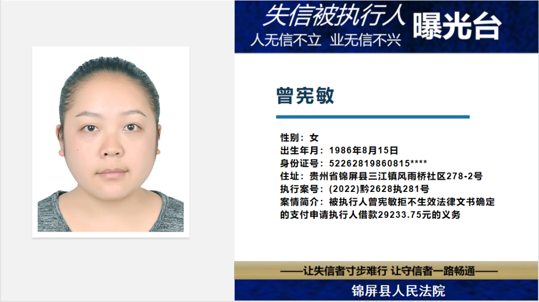 [【微信新闻】] 锦屏县人民法院发布失信被执行人名单!