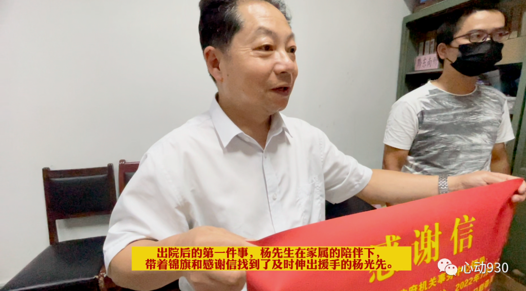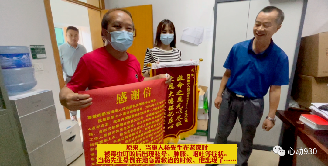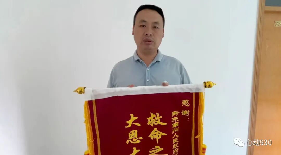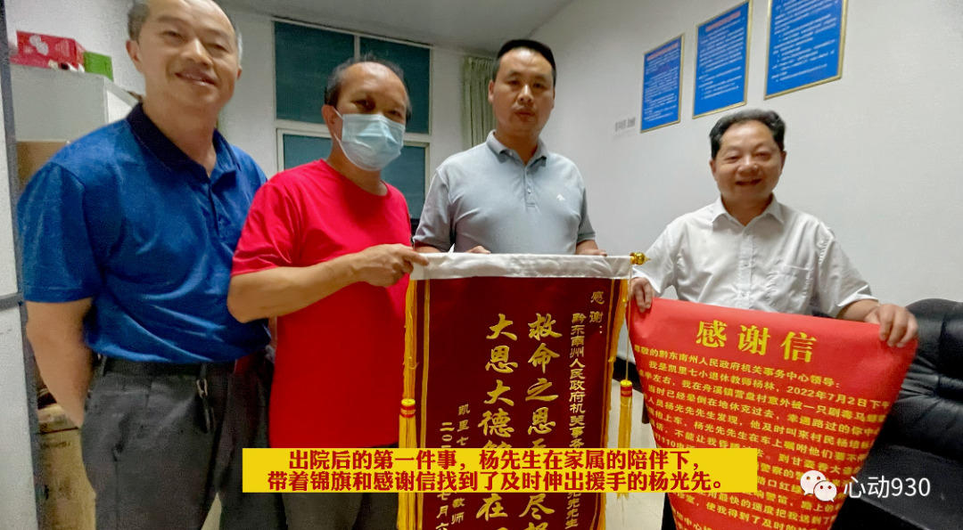 出院后的第一件事,便是打听那天送自己去医院的人是谁,然后做一面锦旗,当面感谢。 7月6日下午,在完成了相关的疫情防控措施要求后,杨林在家人的陪同下,带着一面写有“救民之恩无以尽报,大恩大德铭记在心”字样的锦旗来到黔东南州人民政府机关事务局,送到了正在上班的杨光先的手上。