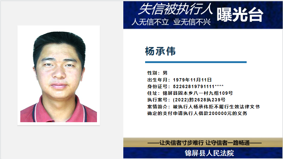 为确保人民法院对生效法律文书的顺利执行,切实维护法律尊严和司法权威,维护当事人的合法权益,根据《最高人民法院关于公布失信被执行人名单信息的若干规定》,本院决定将失信被执行人予以曝光。请社会各界予以监督,希望知情人积极向本院举报失信被执行人员及其财产线索,举报电话:锦屏县人民法院执行局0855-7185512。各失信被执行人请积极到本院履行还款义务!