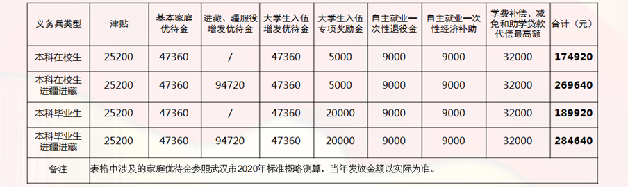 大学生从武汉入伍参军两年可享受经济待遇 单位:元  2 发展前景 01 服役津补贴 由部队发放,义务兵津贴第一年1000元/月、第二年1100元/月,两年可领到约2.5万元。在艰苦边远和高原地区服役的还有额外的地区补贴。 02 士兵考学