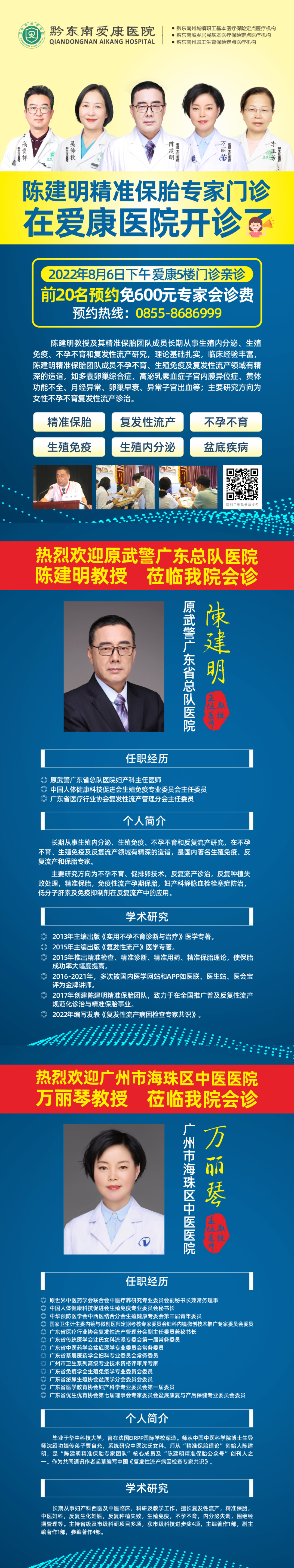 另外,陈建明教授,万丽琴教授将于8月6日下午在爱康医院精准保胎专科门诊进行复发性流产、习惯性流产等疾病会诊活动,请有需求的患者朋友提前预约,提前预约者可免600元专家会诊费。