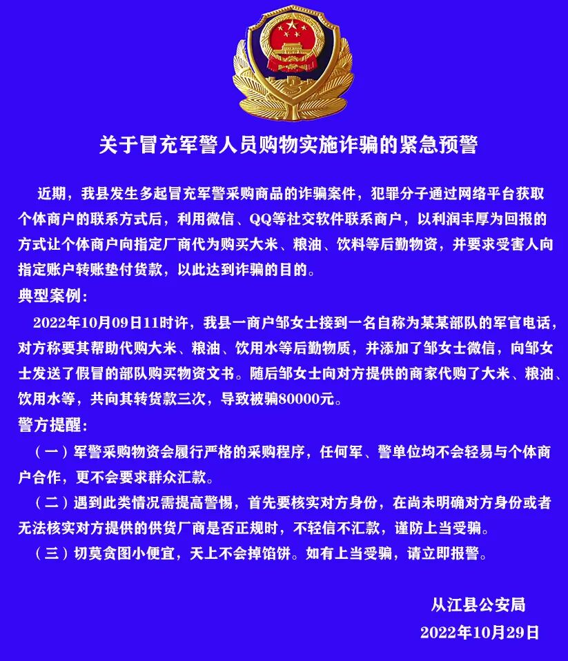 [【微信新闻】] 黔东南一县发布:关于冒充军警人员购物实施诈骗的紧急预警 |