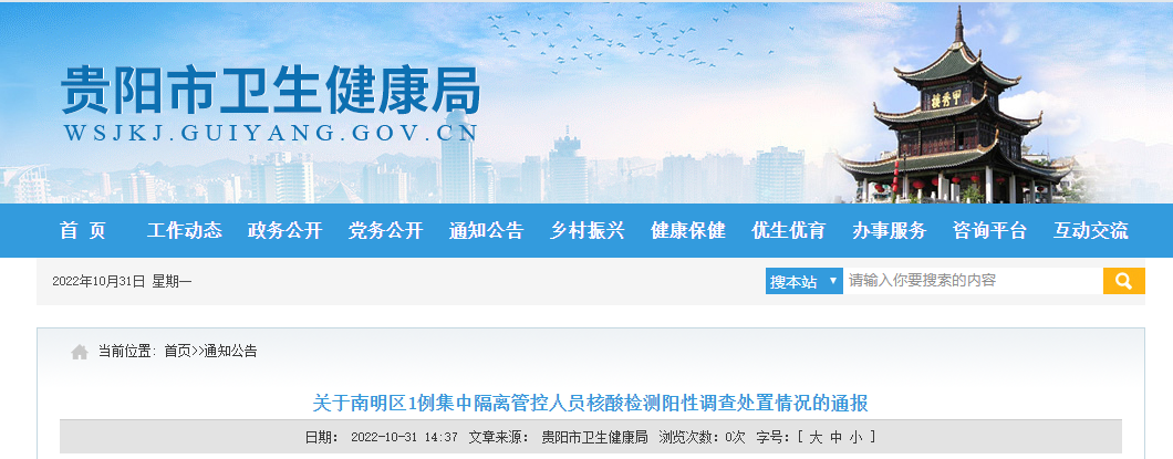 [【微信新闻】] 关于贵阳市南明区1例集中隔离管控人员核酸检测阳性调查处置情况的通报
