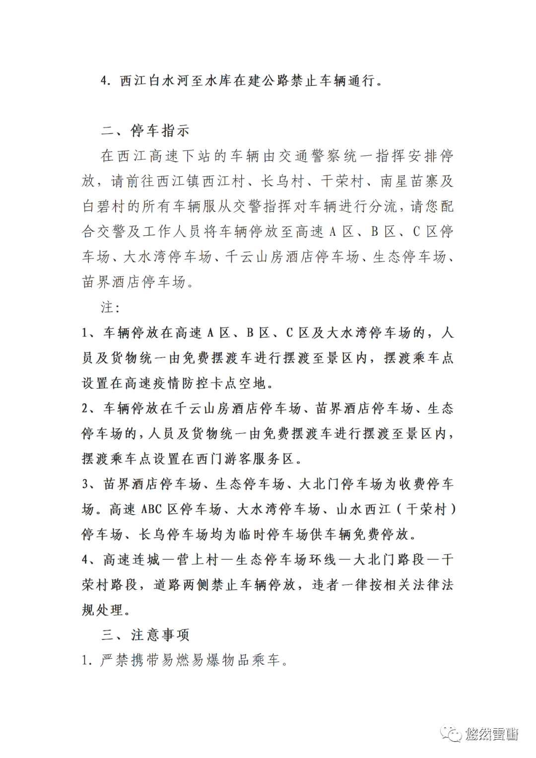 1、车辆停放在高速A区、B区、C区及大水湾停车场的,人员及货物统一由免费摆渡车进行摆渡至景区内,摆渡乘车点设置在高速疫情防控卡点空地。
