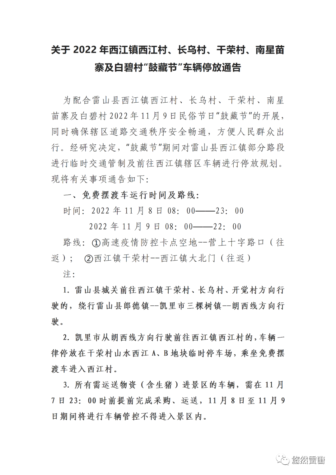 ​ 为配合雷山县西江镇西江村、长乌村、干荣村、南星苗寨及白碧村2022年11月9日民俗节日“鼓藏节”的开展,同时确保辖区道路交通秩序安全畅通,方便人民群众出行。经研究决定,“鼓藏节”期间对雷山县西江镇部分路段进行临时交通管制及前往西江镇辖区车辆进行停放规划。现将有关事项通告如下: